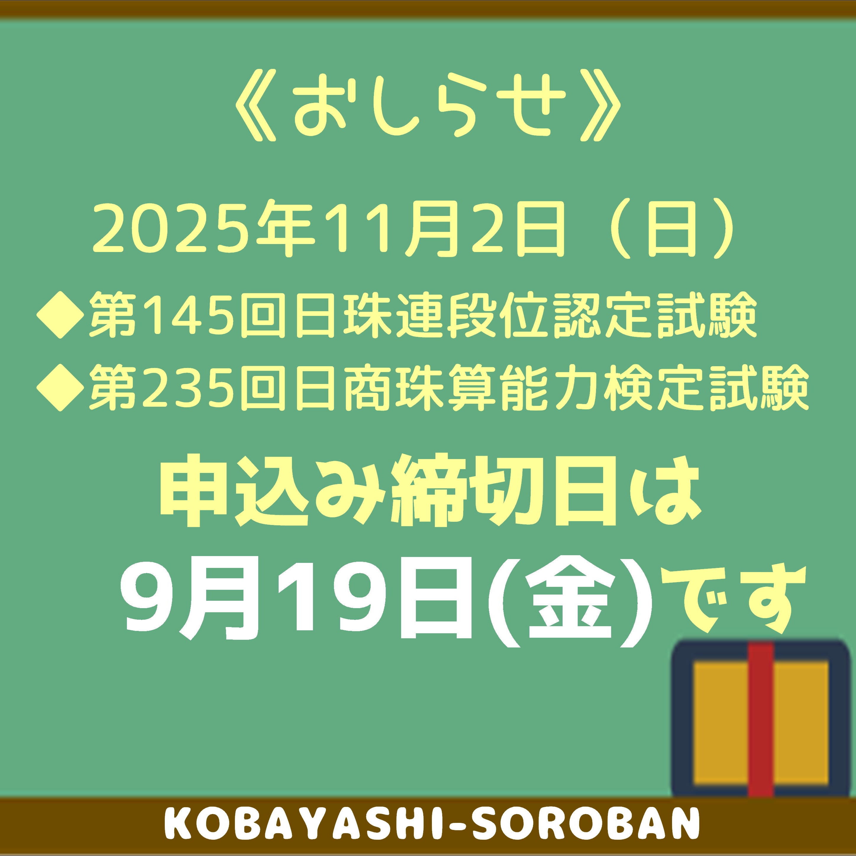珠算検定試験の 申込締切日は9月19日(金) です。