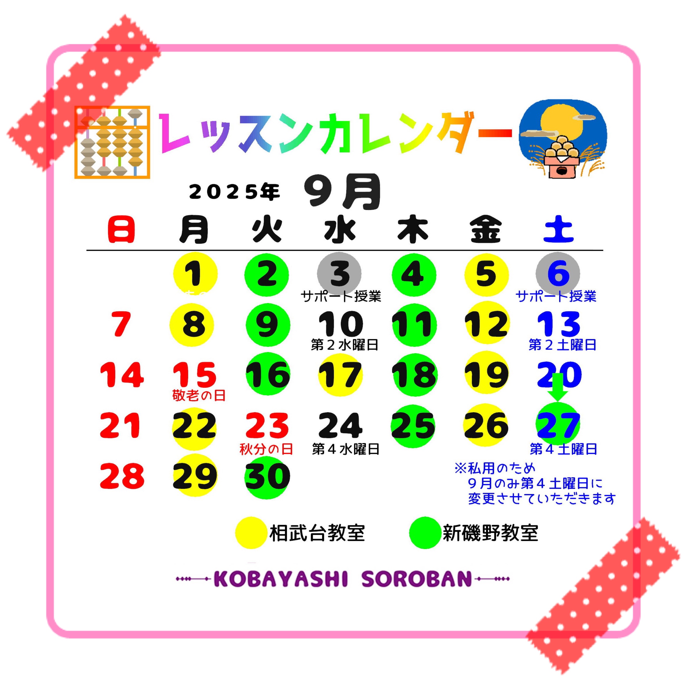 カレンダーにも記載しておりますが、私用のため 9月20日(土) → 9月27日(土) に変更させていただきます🙇♀️