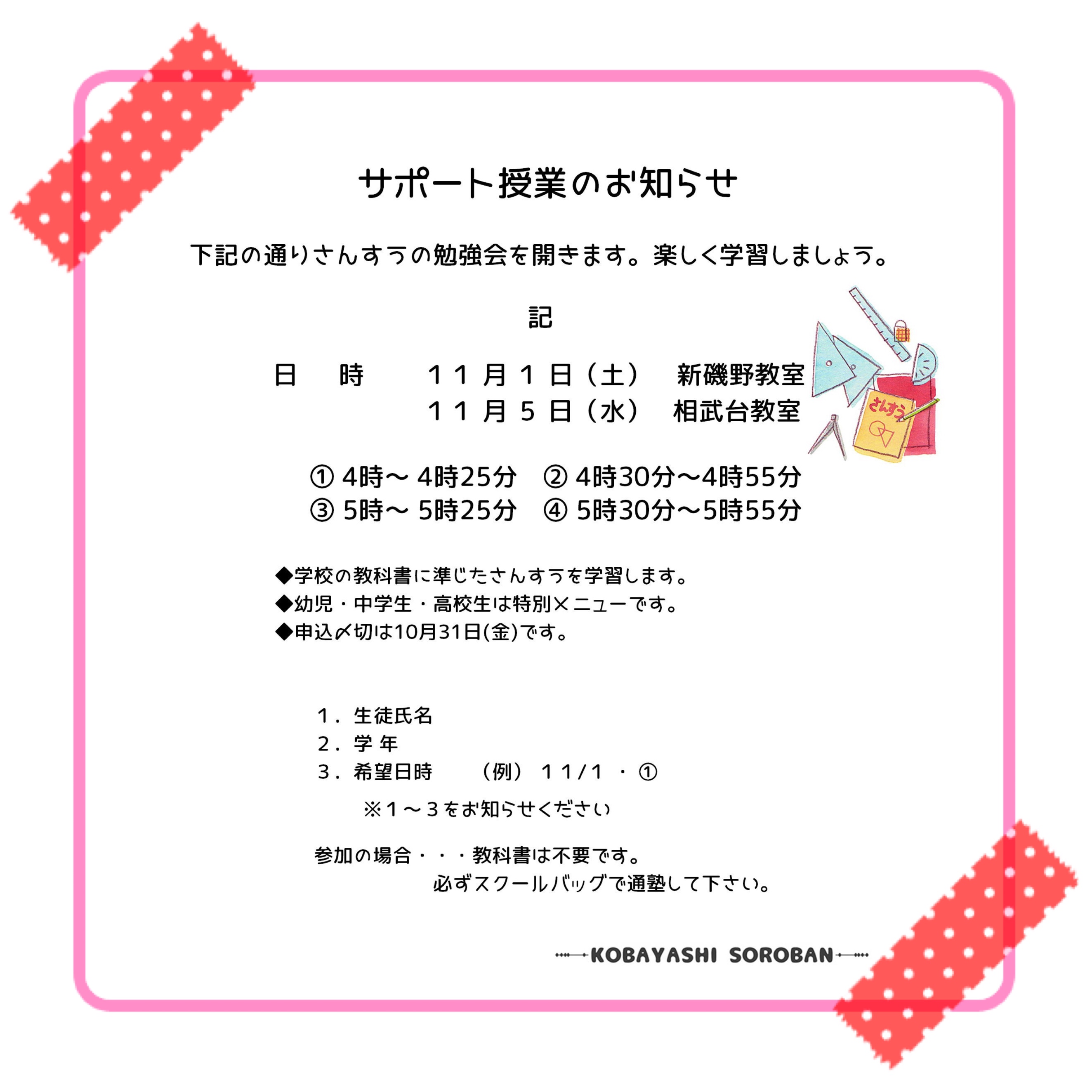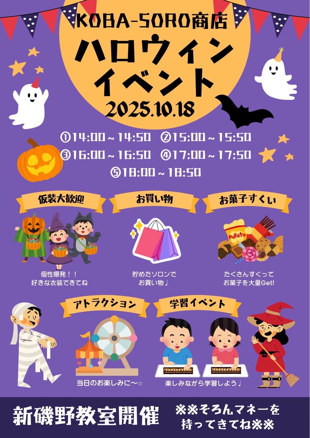 《連絡事項》 ◆お知らせは順次配布しています ◆参加希望の方は10/15(水)までに申込用紙又はLINEにてご連絡ください ◆いつものスクールバッグで通塾してください ◆そろんマネーをお忘れなく ◆仮装大歓迎👻