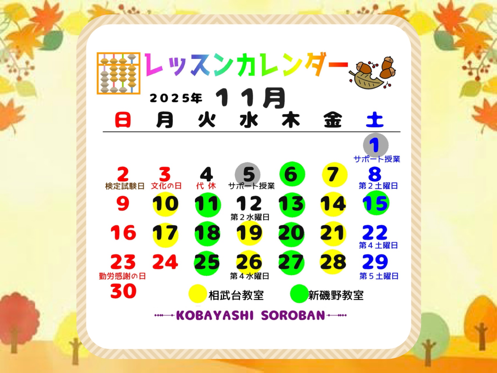 明日11月4日(火)は新磯野教室は代休となります。