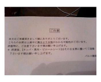 ※ 終演後、【カッパ・黒布?・ビニールシート】はそのまま席においてご退場くださいます様お願い申上げます。 |